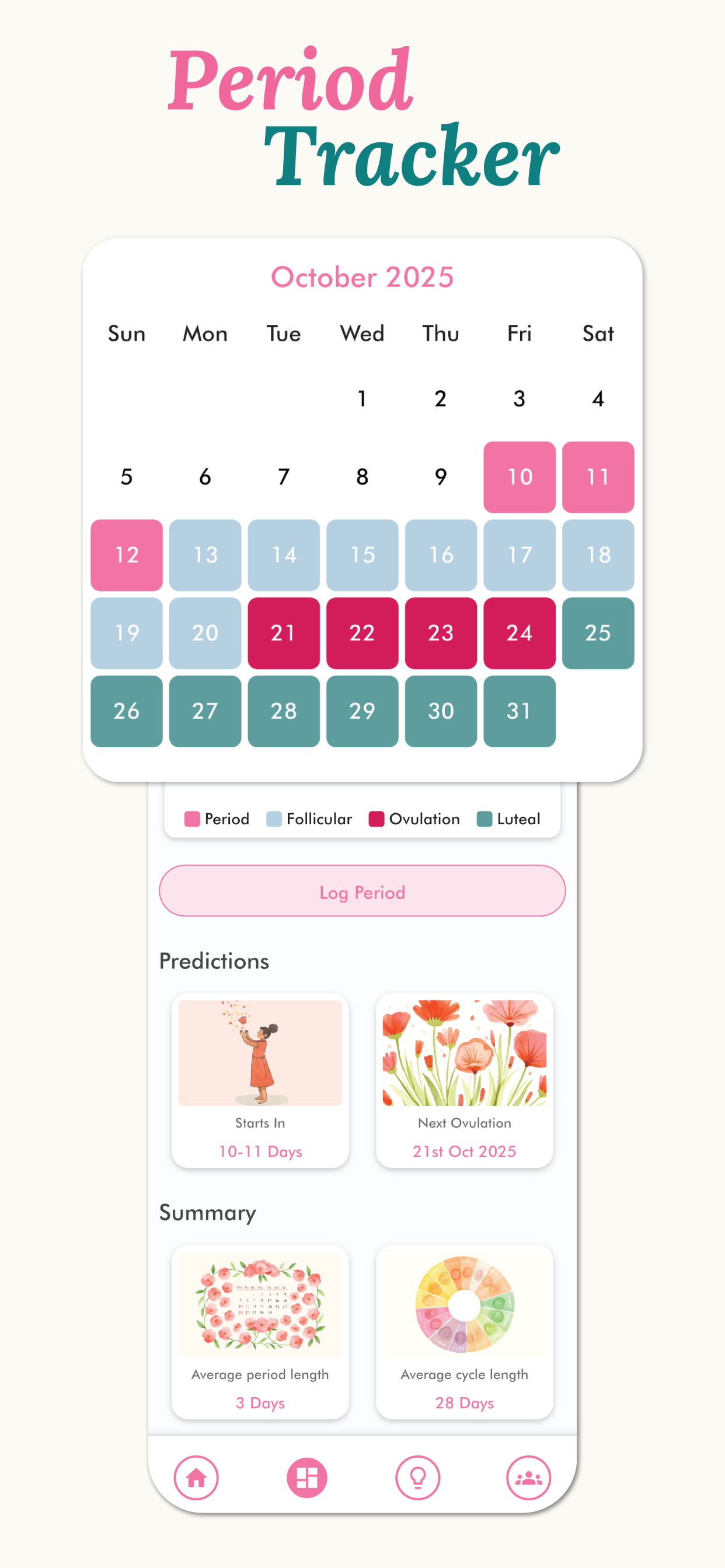 The first period date you enter when installing the app will remain fixed, so please make sure to add it accurately. For the following months, you can update your period dates anytime by using the Log Period button, selecting Clear, and then re-entering your new period start date.