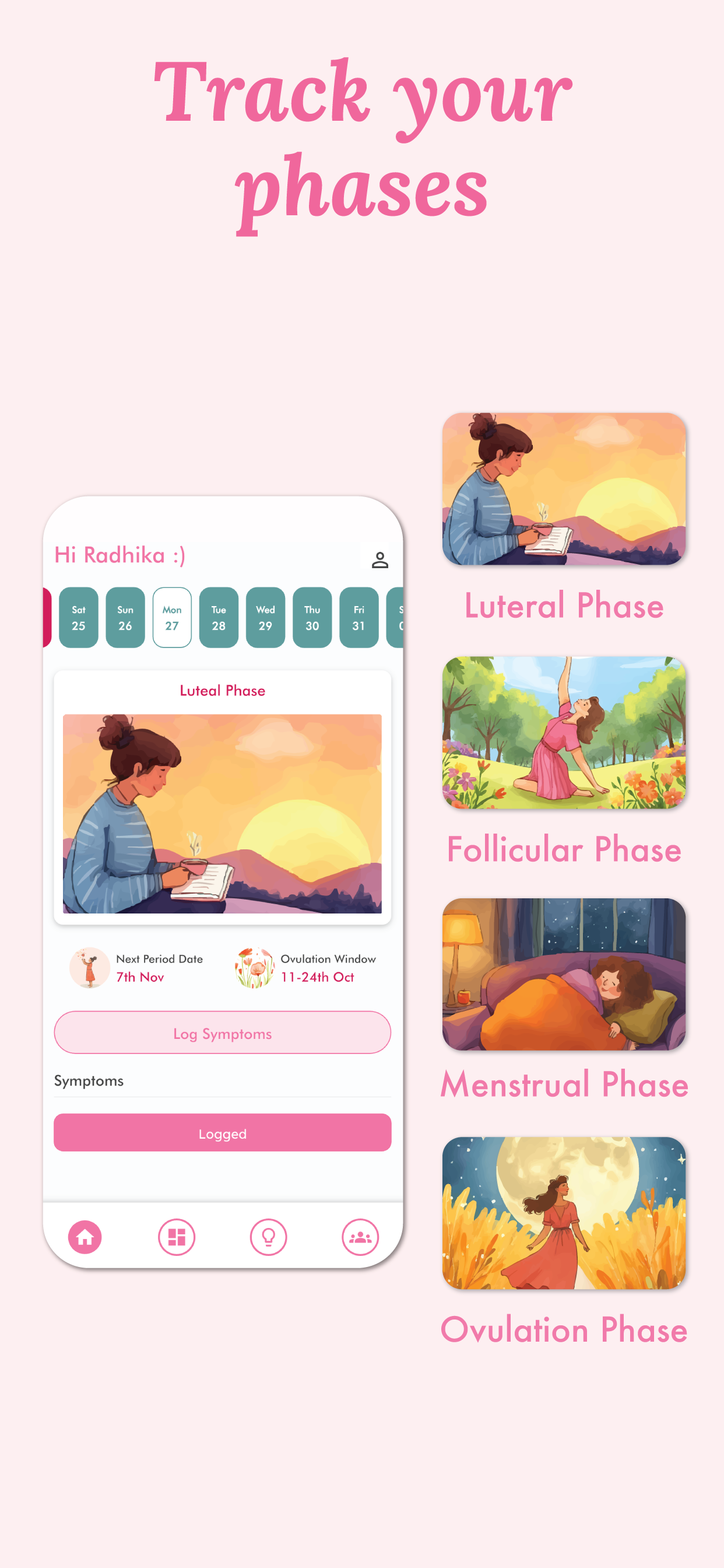 You can log: Periods and cycle length, PMS symptoms, Energy levels, Mood, Sleep and cravings. The app then gives insights for each phase and helps you understand how to support your hormones through food, rest, and simple rituals.